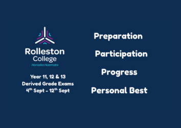 Rolleston College derived grade examinations will take place from Thursday 4 September (week 8) to Friday 12 September (week 9) (note: the CAA Literacy and Numeracy Exams take place Monday 1 to Wednesday 3 September. Only those seniors who have not yet gained these co-requisites will be involved).