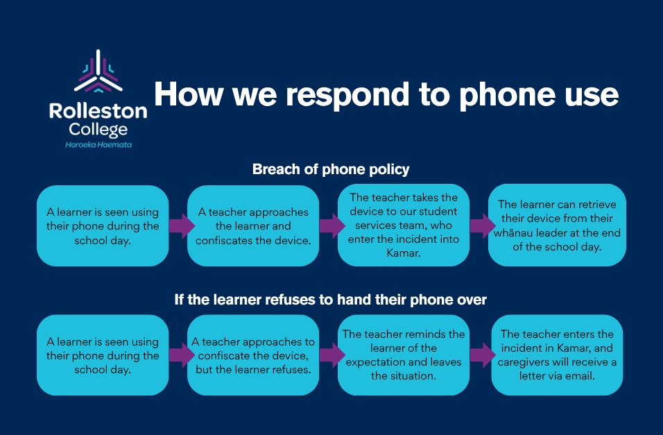 If a learner is found to be using their phone during the hours of operation, it will be confiscated and stored in a secure cabinet at student services. From here, phones are returned to the whānau offices at the end of the day for learners to collect. Whānau/parents and caregivers will be notified of phone use at school, with ongoing issues resulting in meetings/plans being put in place to support the young person's management of their phone.