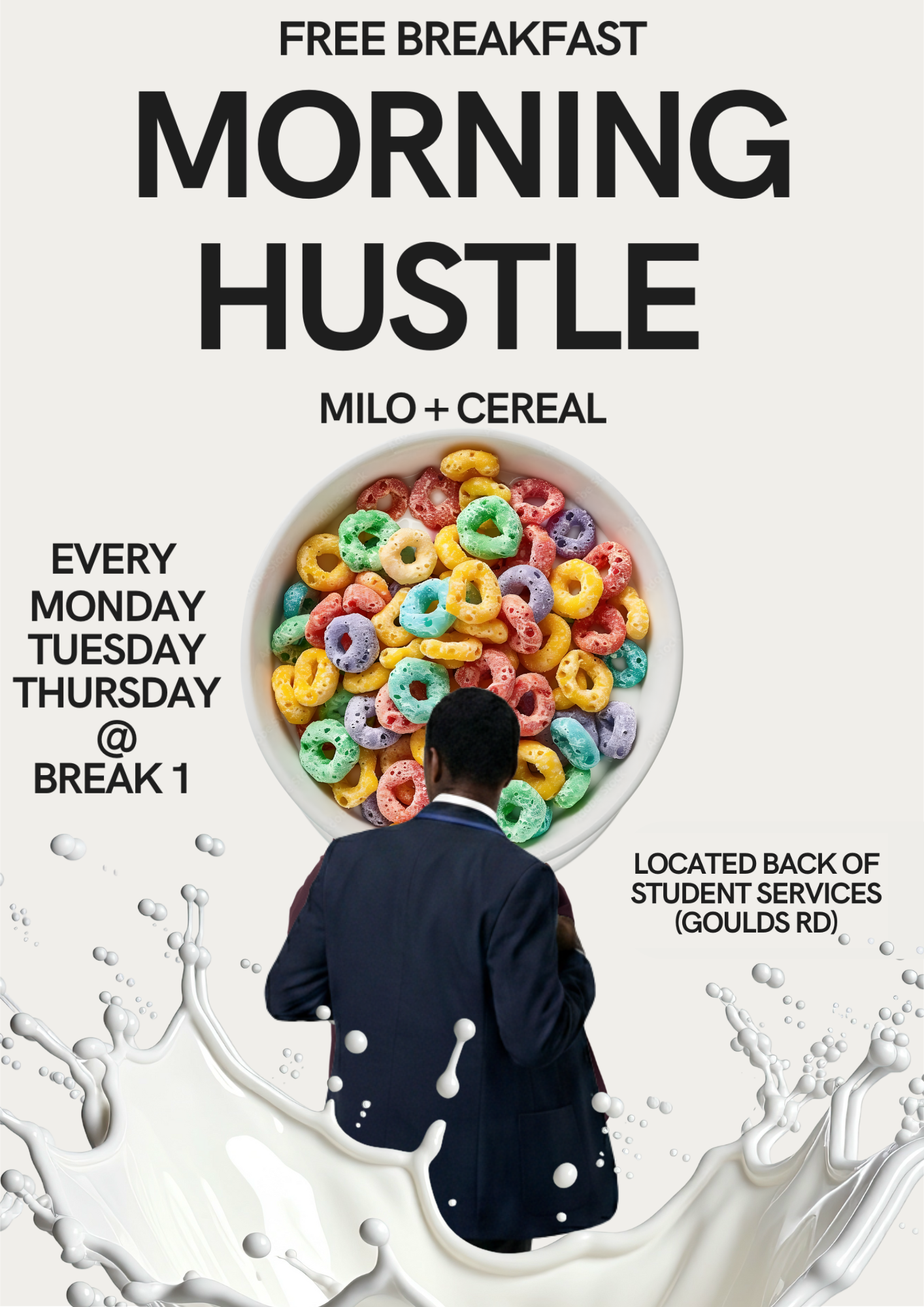 Morning Hustle is located at the back of student services, near our Goulds Road entrance.