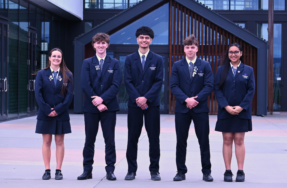 Our head students in 2026 are (left to right): Jade Croskery, Jayden Hill, Tua Tiatia, Mason Cole, and Tavu Likiliki.